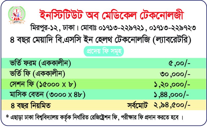 ভর্তি চলছে!📢 ভর্তি চলছে!📢 ঢাকা বিশ্ববিদ্যালয়ের অধীনে ইন্সটিটিউট অব মেডিকেল টেকনোলজিতে বিএসসি ইন হেল্থ টেকনোলজী ল্যাবরেটরি ও বিএসসি ইন ফিজিওথেরাপি কোর্সে ২০২৫-২০২৬ সেশনে ভর্তি চলছে…